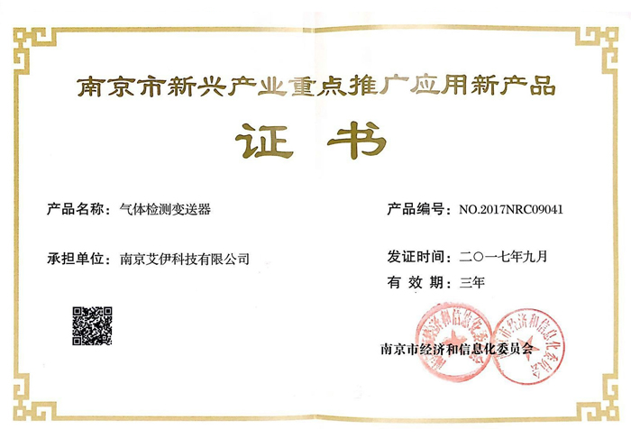 根據(jù)江蘇省政府《關(guān)于進一步加強新技術(shù)新產(chǎn)品推廣應(yīng)用的意見》和市委、市政府《關(guān)于加快培育和發(fā)展戰(zhàn)略性新興產(chǎn)業(yè)打造中國軟件與新興產(chǎn)業(yè)名城的意見》文件精神,為響應(yīng)南京市對新產(chǎn)品的創(chuàng)新研發(fā)、新品推廣,艾伊科技?xì)怏w檢測報警儀系列產(chǎn)品經(jīng)艾伊自主申報、雨花區(qū)擇優(yōu)推薦和專家評審認(rèn)定,最終成功通過認(rèn)定,入選《南京市新興產(chǎn)業(yè)重點推廣應(yīng)用的新產(chǎn)品目錄》。