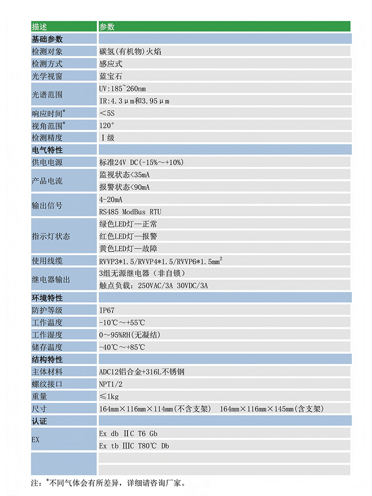 名稱:火焰探測(cè)器 檢測(cè)原理:感光式 光譜范圍:UV:185~260nm/IR1:4.3μm/IR2:3.95μm 玻璃材質(zhì):藍(lán)寶石 | 防爆等級(jí):Ex db ⅡC T6 Gb/Ex tb ⅢC T80℃ Db 防護(hù)等級(jí):IP67 響應(yīng)時(shí)間:<5s 工作溫度:-10℃~+55℃ |