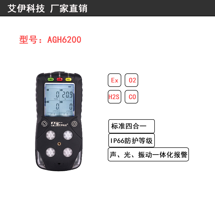 艾伊科技AGH6200型便攜式氣體檢測報警儀為標準四合一氣體檢測報警儀,產(chǎn)品可同時檢測可燃氣體、氧氣、一氧化碳和僑化氫的濃度值,當環(huán)境中相應(yīng)氣體濃度超過安全界限時,自動盧、光、振動報警提醒工作人員。